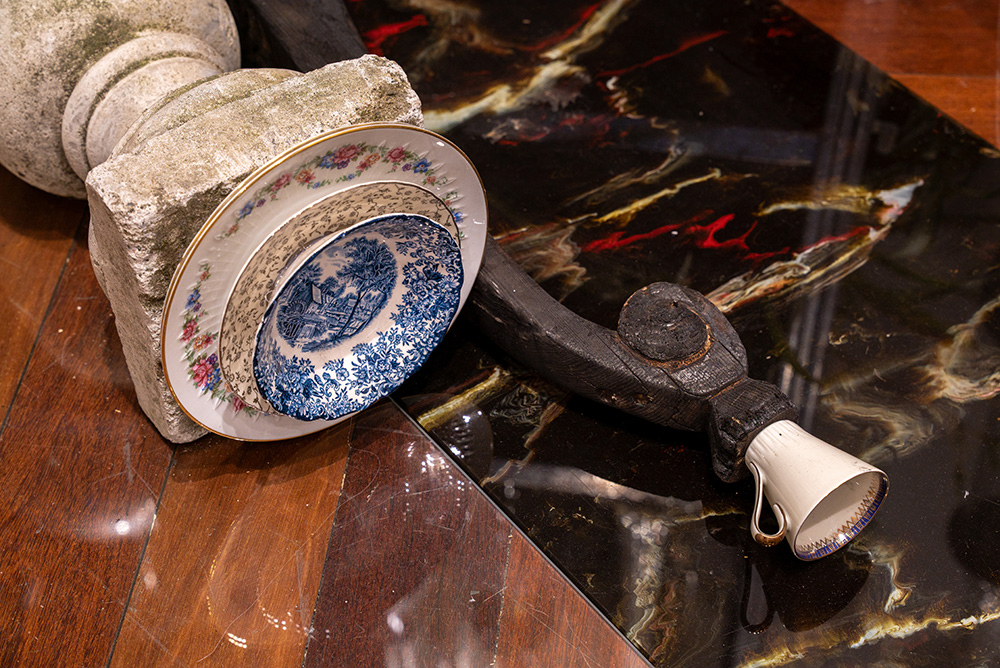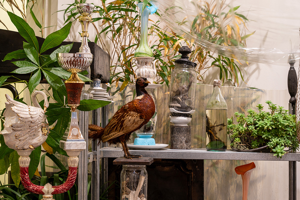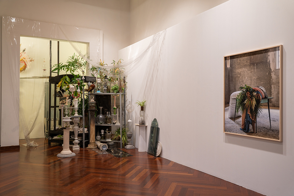 Attraverso la fotografia e l’installazione ambientale Chiara Bettazzi indaga l’idea di trasformazione in relazione al paesaggio industriale e all’elemento vegetale. Sin dagli esordi la sua ricerca è legata a una riflessione sull’accumulo di oggetti d’uso quotidiano e il loro riutilizzo in composizioni che evocano presenze animate. Nei ritratti fotografici di Palazzo Braschi a prendere vita sono oggetti domestici assemblati a elementi vegetali: un materasso avvolto da panneggi e lenzuola, una stampella, l’anta di un armadio, un supporto ligneo e un tavolino da cucina sostengono una composizione di fiori finti che si affaccia da una delle estremità. L’artista mette in scena la metamorfosi degli elementi fotografati in diverse pose nel cantiere dell’ex convento di Sant’Orsola a Firenze: ad animare queste figure dal carattere fantasmatico è la progressione sequenziale degli scatti. La successione di immagini testimonia l’azione quasi performativa dell’artista che ne compone e scompone le parti, mantenendosi dietro le quinte, esclusa dallo sguardo. A metà fra nature morte e deposizioni, questi assemblaggi suggeriscono uno stato di permanente dinamismo del soggetto legato all’evoluzione degli accadimenti naturali. L’installazione ambientale che accompagna le fotografie vive invece di una precarietà costitutiva, strettamente legata alla temporalità della mostra: è attraverso l’ibridazione di materiali organici e inorganici che la composizione prende forma, in direzione di un equilibrio caotico in cui ogni elemento trova la sua collocazione naturale.
